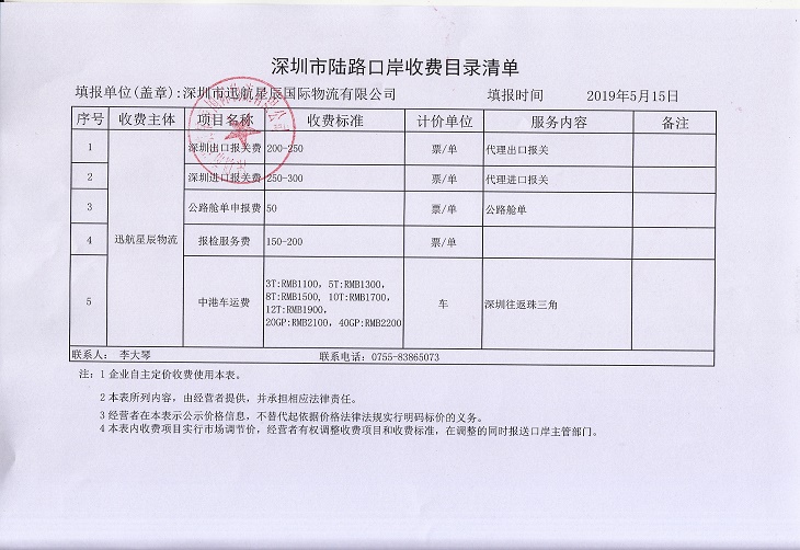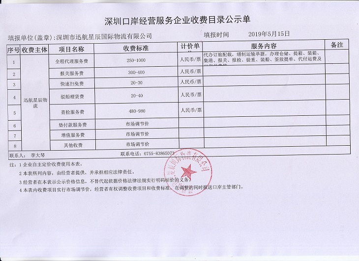 深圳市迅航星辰国际物流有限公司收费目录清单