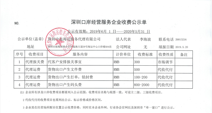 深圳中远海运船务代理有限公司收费目录清单