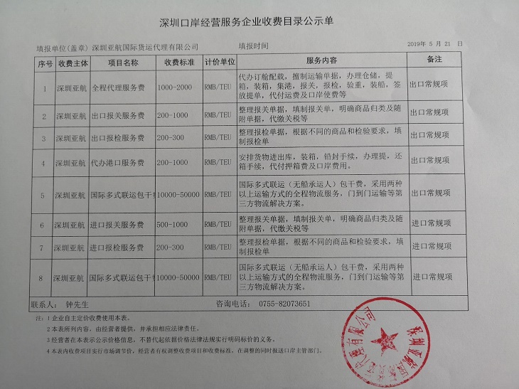 深圳亚航国际货运代理有限公司收费目录清单